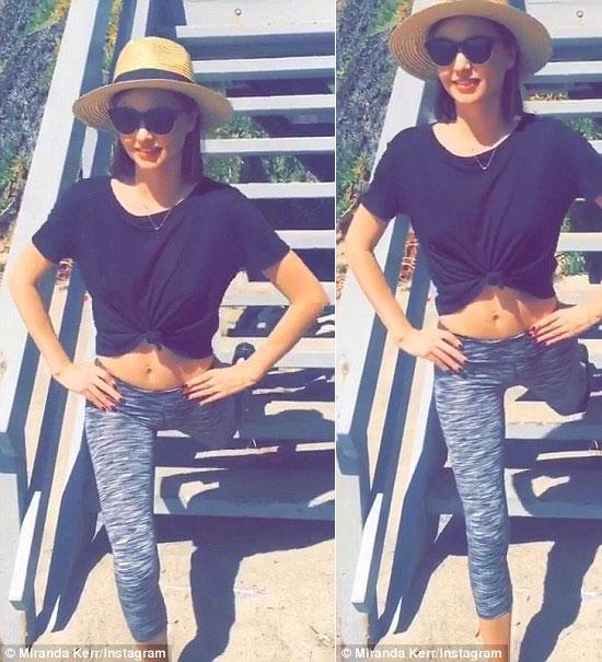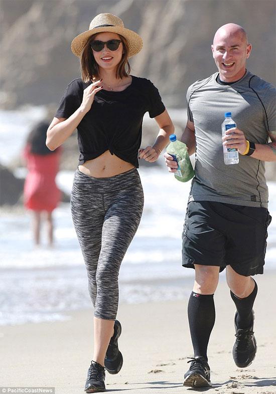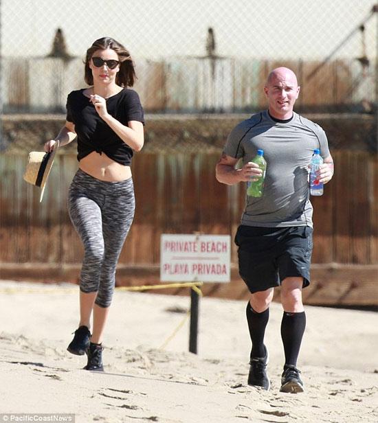 Miranda Kerr mới đây được bắt gặp trong buổi tập cùng huấn luyện viên trên bãi biển Malibu. Cô diện áo phông buộc túm, quần legging khoe vóc dáng gợi cảm, vòng eo thon thả. Người hâm mộ còn dễ dàng nhận ra, cựu thiên thần Victoria's Secret "thả rông" vòng một lấp ló.