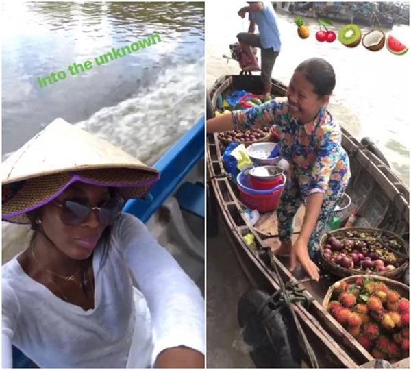 Trong 3 ngày qua, cựu siêu mẫu tiếp tục hành trình khám phá Việt Nam. Hôm 31/5, cô chia sẻ hình ảnh tự chụp trong chuyến đi về miền Tây, trải nghiệm chợ nổi bán trái cây. Campbell cũng đội nón lá Việt Nam và chụp selflie với lời nhắn: "Đi vào chốn lạ" (Into the unknown).