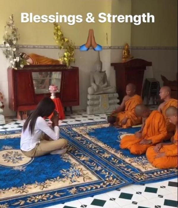 Một bức ảnh khác cho thấy người mẫu đã đến thăm một ngôi chùa ở Việt Nam và gặp gỡ các vị sư. Cô cũng chú thích "Cầu nguyện và sức mạnh" cho hình ảnh này.