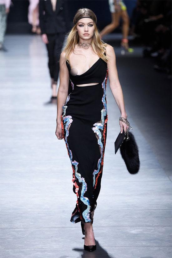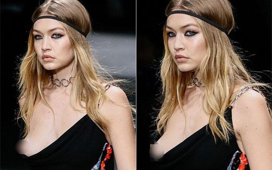 Gigi Hadid cũng gặp phải trường hợp "khóc dở mếu dở" vì "hớ hênh" trong show diễn Thu Đông 2016 của thương hiệu Ý Versace.
