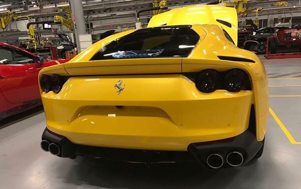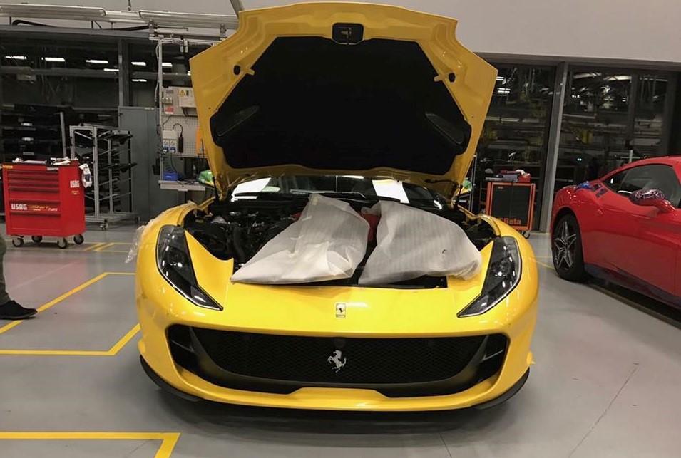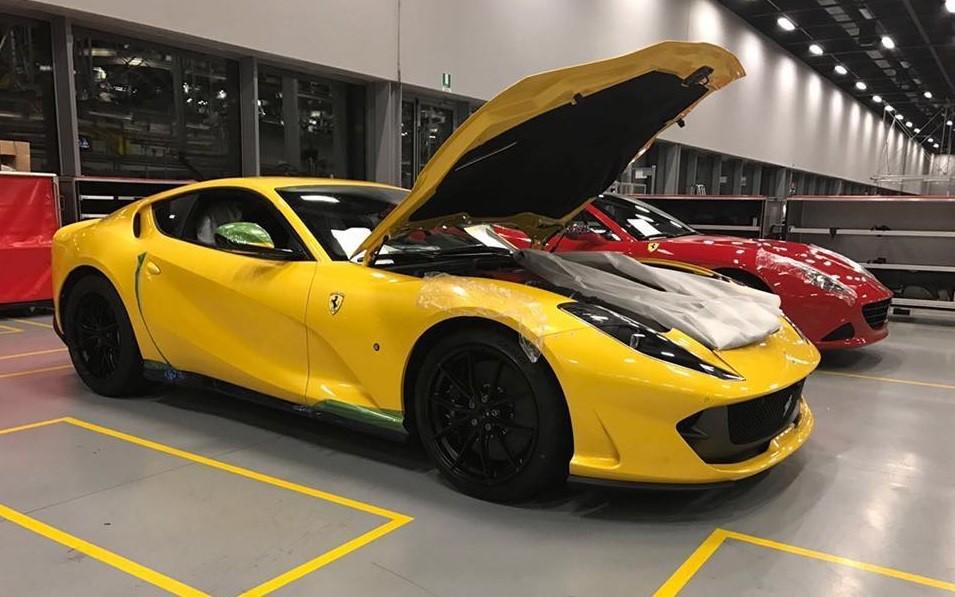 Ferrari 812 SuperFast màu vàng được chụp bên trong nhà máy của hãng tại Maranello (Italy). Đây là