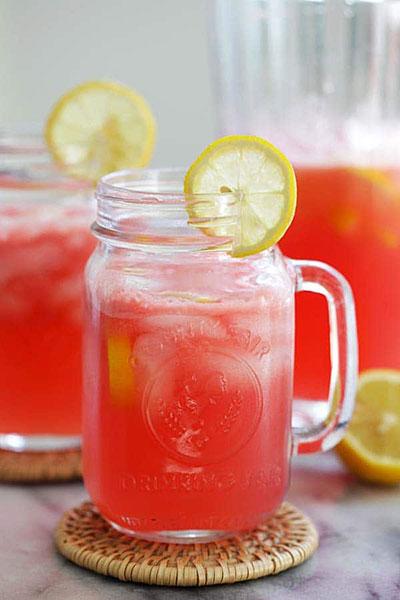 - Đổ nước dưa hấu xay vào bình, thêm nước chanh, seltzer, đá lạnh, chanh thái lát, khuấy đều.