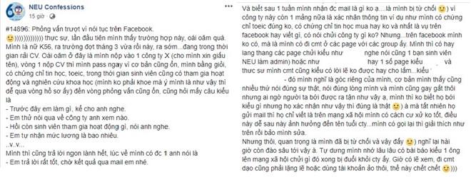 Lý do trượt vòng phỏng vấn xin việc của bạn gái mới ra trường trên trang NEU Confession mới đây thu hút hàng nghìn bình luận và chia sẻ. Nhiều người cho rằng câu chuyện này được quan tâm vì khá quen thuộc với giới trẻ hiện nay.