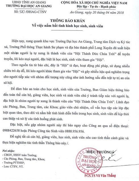 Ngày 20/4, ĐH An Giang cũng ra thông báo yêu cầu học sinh, sinh viên tránh tiếp xúc những người tự xưng là thành viên của "Hội Thánh Đức Chúa Trời".