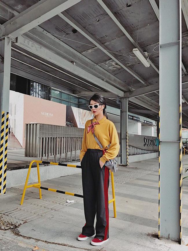 ... lúc lại ngẫu hứng với áo nỉ, quần sọc và giày thể thao. Điểm nhấn là chiếc khăn thắt xinh xắn trên cổ áo.