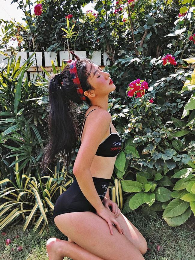 Ngay cả khi khoe dáng với bikini, Quỳnh Anh Shyn cũng rất chịu khó đầu tư phụ kiện và trang điểm.
