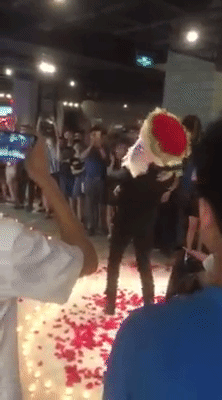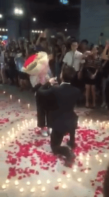 Hãy nhìn xem, trước khi "ra trận", nguyên 1 hành lang của rạp chiếu phim đã được chàng trai và bạn bè trang hoàng bằng hoa hồng và nến rực rỡ. Chắc chắn màn cầu hôn này rất công phu, bởi chàng trai đã huy động cả máy quay phim, thợ chụp ảnh, thậm chí mở sẵn nhạc "Nắm lấy tay anh" vang vọng cả rạp. Và trong khung cảnh đó, cô gái xuất hiện, như một nàng công chúa, tiến tới, nhận lấy lời cầu hôn cùng nhẫn và một nụ hôn ngọt ngào của chàng.