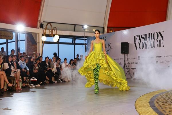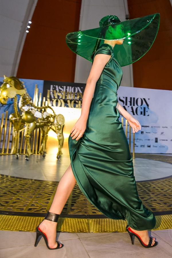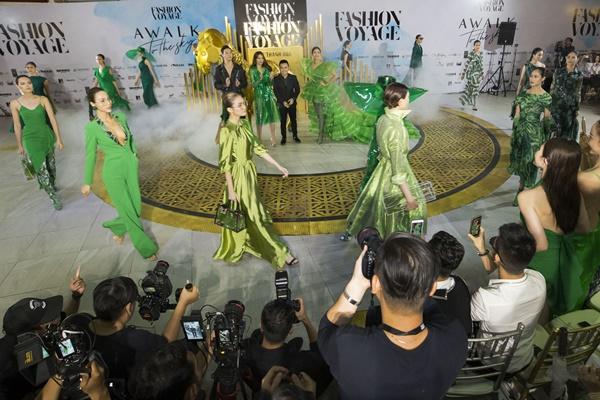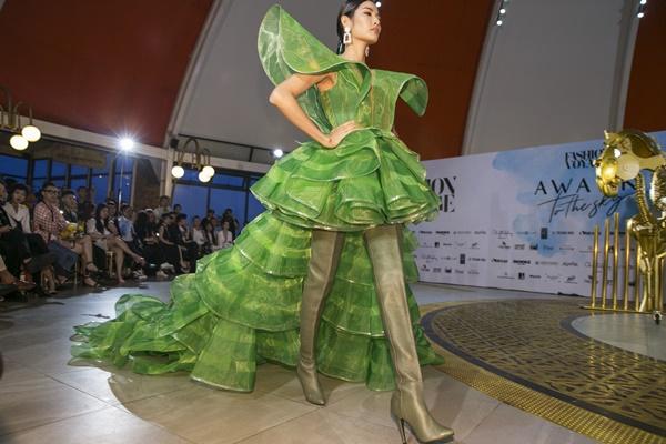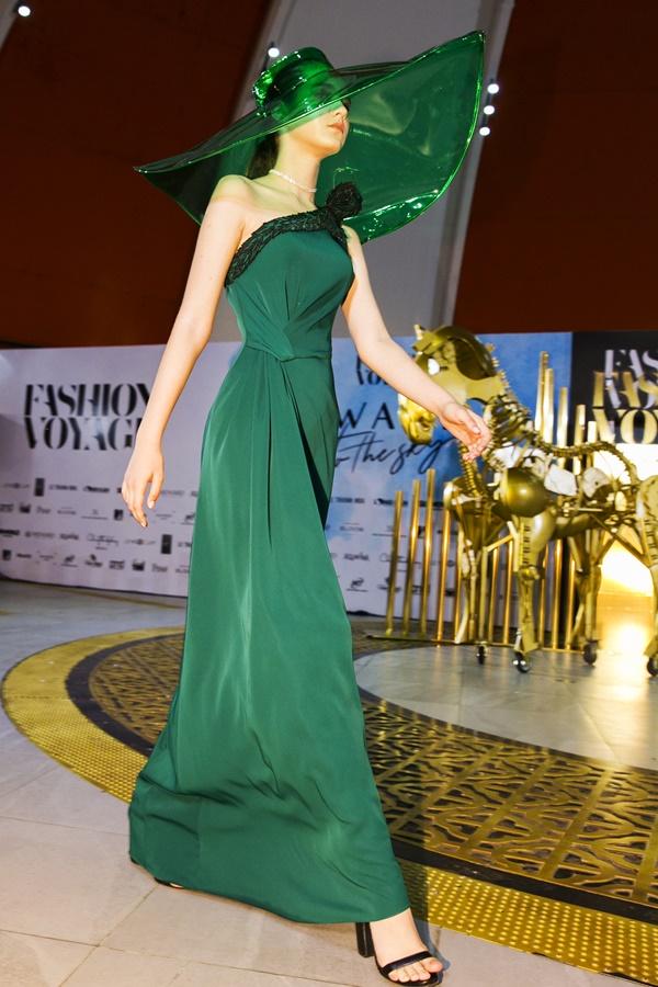 Trong show diễn thời trang Fashion Voyage với chủ đề Dạo bước trên mây, siêu mẫu - diễn viên Thanh Hằng là người đảm nhận vị trí vedette cho BST Greencode của NTK Lê Thanh Hòa.