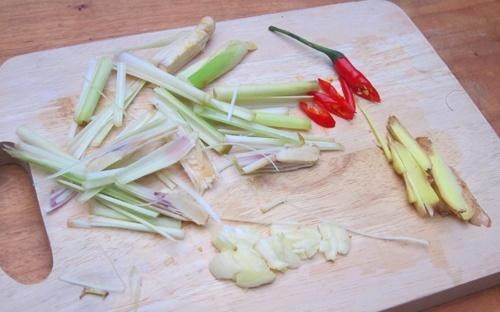 - Gừng, nghệ, sả bạn rửa sạch, bỏ vỏ rồi tiến hành đập dập, băm nhỏ. Với ớt và quế bạn cũng thực hiện tương tự như vậy, nhưng nhớ bỏ hạt ớt đi nhé. Lá trà xanh rửa thật sạch.