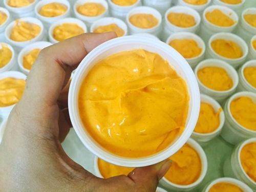 - Tiếp tục cho dầu gấc vào, khuấy đều cho hỗn hợp hòa quyện vào nhau đồng nhất thì trích dịch vitamin E đã chuẩn bị cho vào. Đánh đều rồi cho vào hũ để dùng dần là được.