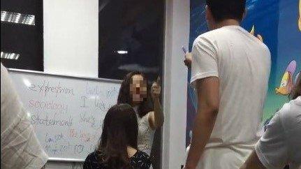 Trước khi mời học viên ra khỏi lớp, cô giáo đã có những lời nói mất kiểm soát: “Ra ngoài kia, có 1 hay 10 trung tâm cũng không thể biến một con lợn thành một con người được đâu” hay “Chúng tao không để cho những thằng mặt lợn như mày học ở đây”, “Loại mặt người óc lợn”,...