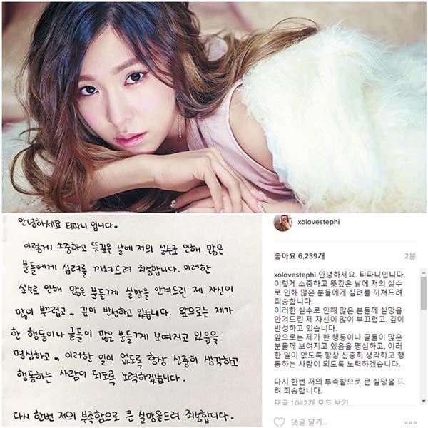 Sau đó, Tiffany cũng đã đăng tải lời xin lỗi trên instagram cá nhân: "Xin chào, tôi là Tiffany. Tôi xin lỗi vì đã khiến nhiều người phải lo lắng vì sai lầm của tôi vào một ngày có ý nghĩa và đáng quý như hôm nay. Tôi rất xấu hổ vì hành động này và đang nghiêm túc suy nghĩ lại. Từ giờ trở đi, tôi sẽ nố lực hơn nữa khi biết có rất nhiều người đang theo dõi mình, cũng như cẩn trọng hơn nữa. Một lần nữa, tôi xin lỗi vì đã khiến mọi người thất vọng vì lỗi lầm của tôi".