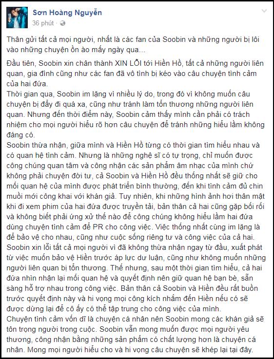 "Đầu tiên, Soobin xin chân thành xin lỗi tới Hiền Hồ, tất cả những người liên quan, gia đình cũng như các fan đã vô tình bị kéo vào câu chuyện tình cảm của hai đứa.