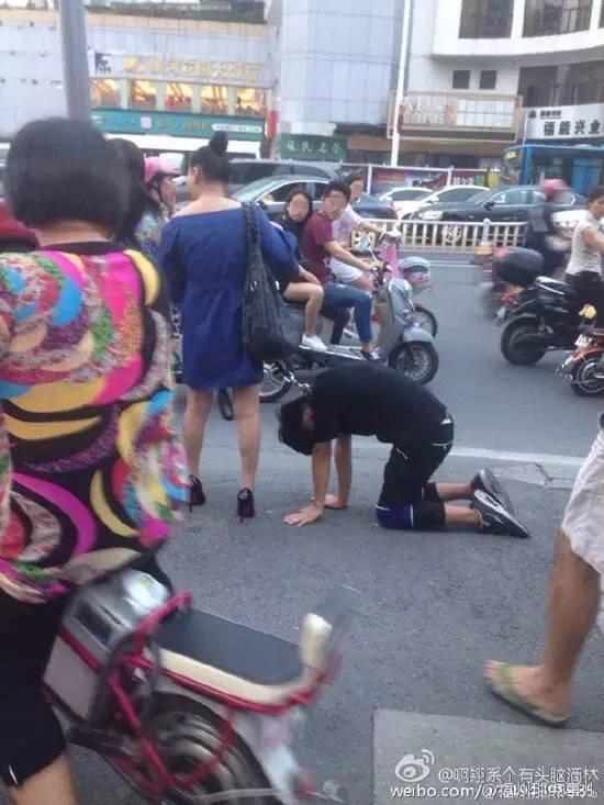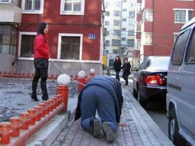 Trong hình, người ta có thể dễ dàng nhìn thấy hình ảnh một người phụ nữ khá trẻ tuổi, đang mặc mặc một chiếc váy màu xanh và giày cao gót, nắm sợi dây kéo theo là một người đàn ông bò theo trên đường phố Phúc Châu.