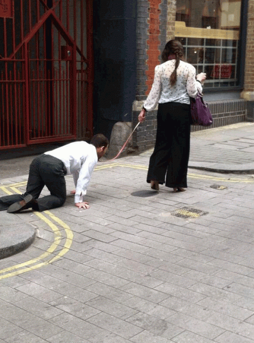 “Thật sự tôi đã thấy một phụ nữ đi bộ dắt theo một người đàn ông hành động như một chú chó. Anh này bò theo bằng đầu gối trên con đường đông đúc”. Một người chứng kiến cho biết với vẻ sững sờ.