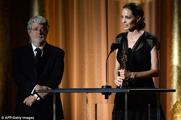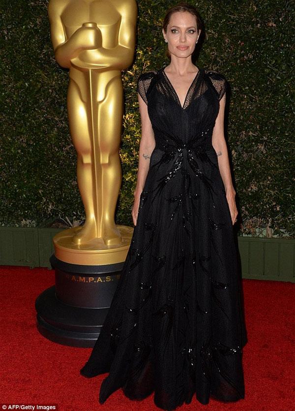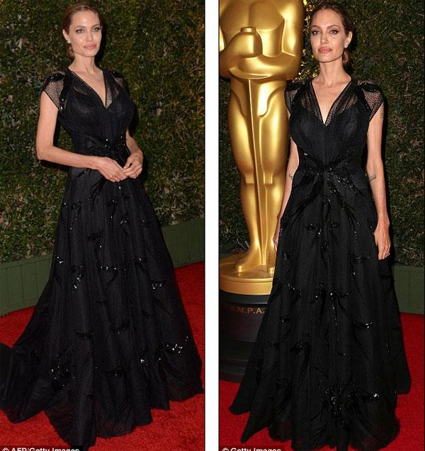Xuất hiện trên thảm đỏ Governors Awards 2013 được tổ chức tại trung tâm Hollywood và Highland mới đây, Angelina Jolie diện chiếc đầm đen dài thiết kế đính sequin nổi bật kết hợp mái tóc búi cao và gương mặt trang điểm nhẹ nhàng, nữ diễn viên 38 tuổi toát lên nét quý phái của người phụ nữ thành đạt. Tại giải thưởng, Angelina Jolie vinh dự được nhận giải thưởng nhân đạo Jean Hersholt.