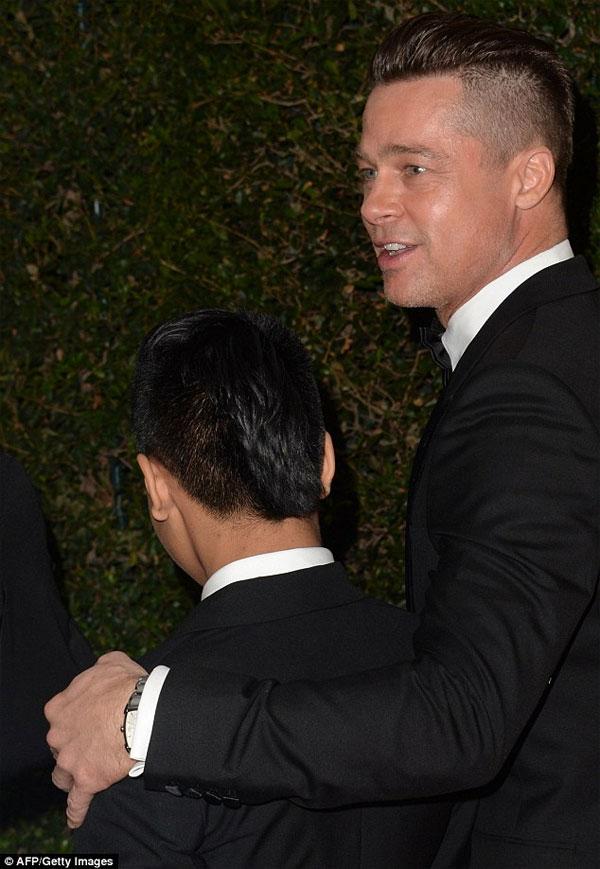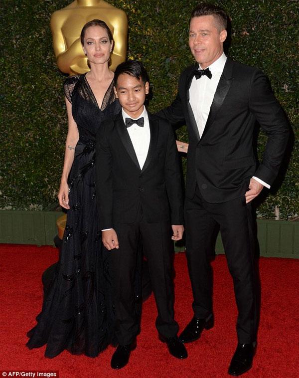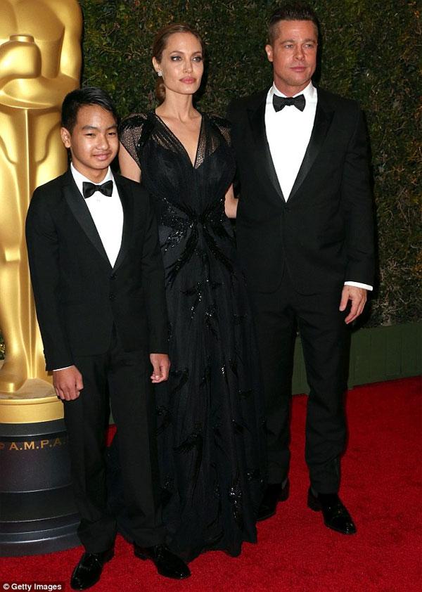 Tuy nhiên thần thái của 'Bà Smith' vẫn rất rạng ngời bên vị hôn phu Brad Pitt và cậu con trai nuôi Maddox. Hai bố con mặc vest lịch lãm đứng tạo dáng tự tin cùng Jolie trên thảm đỏ.