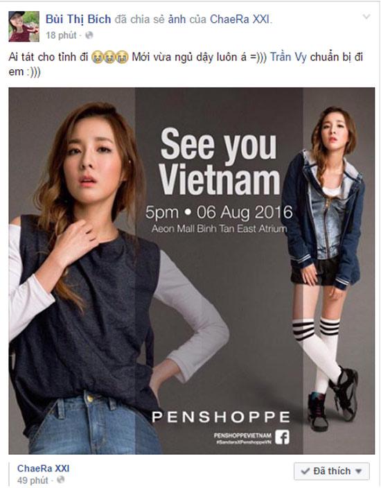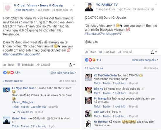 Trang fanpage Dara 2NE1 Vietnam FC đã nhanh chóng chia sẻ lại thông tin thần tượng của mình sắp đến Việt Nam. Ngay lập tức bài chia sẻ đã nhận được gần 1000 like và gần 200 lượt chia sẻ.