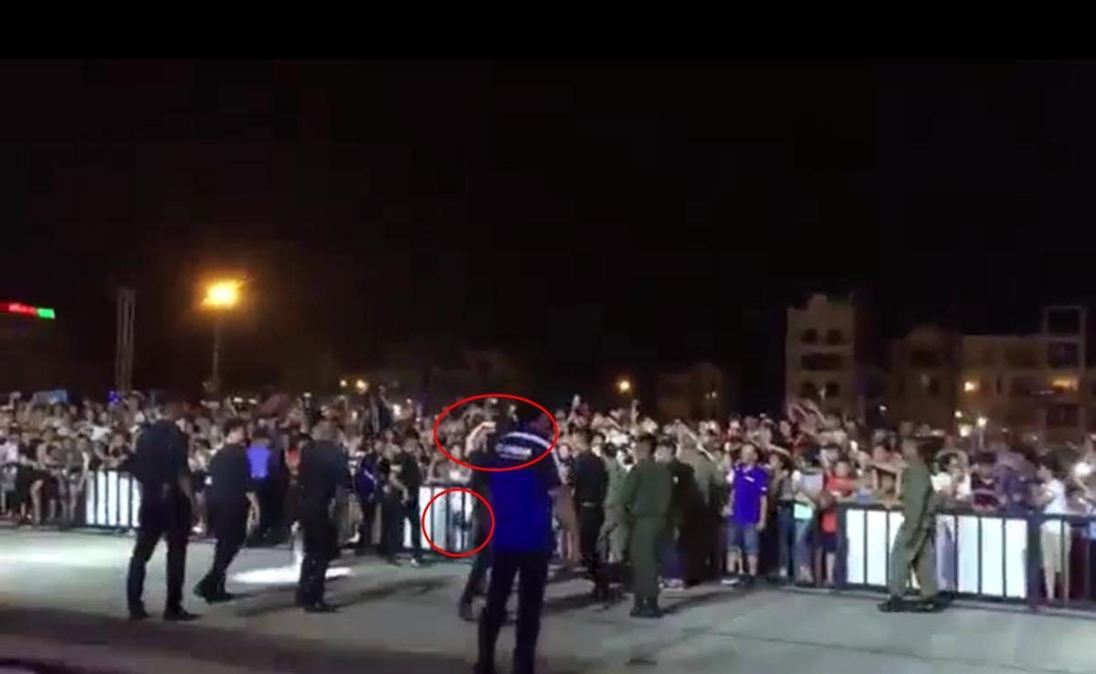 Theo hình ảnh từ clip, một nam thanh niên mặc áo đen bất ngờ ném vật màu đen thẳng về phía nam ca sĩ đang đứng vòng tay hình trái tim chào khán giả, trước khi kết thúc tiết mục biểu diễn. Quá bất ngờ trước hành động bộc phát của fan cuồng, Sơn Tùng giật mình thốt lên: “Ồ, thế này là không được”.