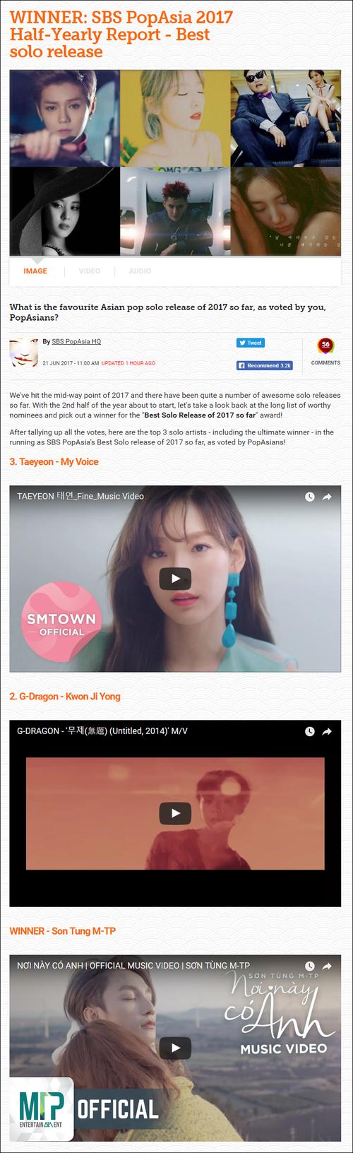 Trưa hôm nay 26/7, SBS PopAsia 2017 vừa công bố kết quả với giải thưởng Sản phẩm solo xuất sắc nhất được trao cho đại diện Việt Nam Sơn Tùng M-TP.