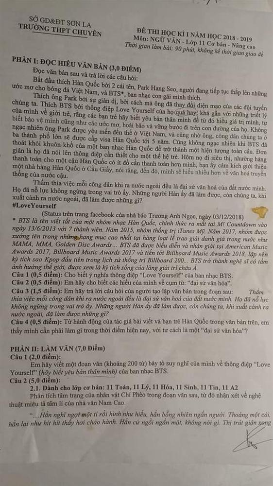 Trong đề thi Học kỳ I của lớp 11 trường THPT Chuyên Sơn La, giáo viên cũng đã đưa nhóm nhạc BTS và ông Park Hang Seo vào để hỏi về việc mỗi người khi đi ra nước ngoài đều là đại sứ văn hoá, còn chúng ta, khi xuất cảnh đã làm được gì?