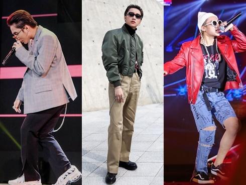 Giọng ca "Lạc Trôi" thường xuyên diện áo vest trễ vai cùng quần tây rộng và giày sneaker hầm hố.