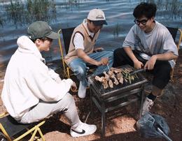 Anh chọn hình thức cắm trại, nướng thịt bên hồ cùng những người bạn thân. Trang phục cũng cực kì thoải mái với áo hoodie, quần jogger khác hẳn vẻ bóng bẩy "chủ tịch" thường thấy.