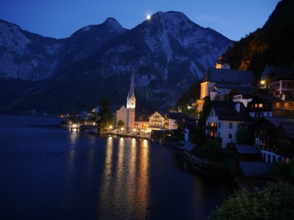 Tại ga Hallstatt, có duy nhất lối đi để đến được làng, đó là… xuống hồ rồi lên phà đang chờ sẵn các du khách. Từ bến phà nhìn qua bên kia hồ, ngôi làng thơ mộng dần hiện ra trước mắt bạn. Trong ảnh, Hallstatt lung linh trong đêm.