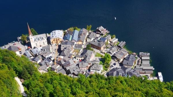 Từ đỉnh núi phía sau làng, bạn có thể ngắm nhìn toàn cảnh nơi đây, để cảm nhận rằng dường như Hallstatt là một minh chứng rõ ràng nhất cho sự chung sống hài hòa của con người với thiên nhiên. Để lên được điểm chụp hình lý tưởng này, bạn có thể lựa chọn thang máy hoặc đường bộ. Hành trình leo vừa tiết kiệm chi phí, vừa rất đáng giá vì hái được nhiều quả rừng và còn được chiêm ngưỡng một dòng suối mát lạnh.