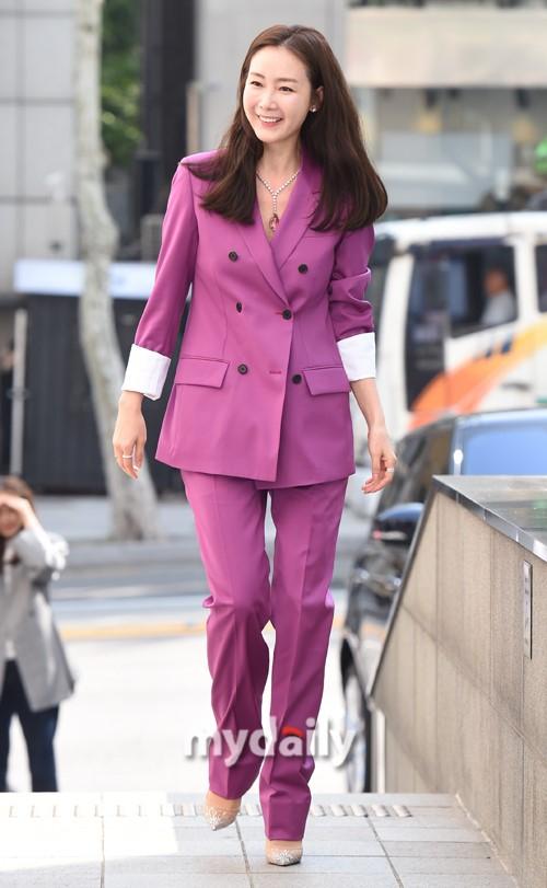 Mỹ nhân "Bản tình ca mùa đông" - Choi Ji Woo được nhận xét bầu bĩnh lên trông thấy kể từ khi lập gia đình. Lựa chọn trang phục vest tím, nữ diễn viên khoe được chiều cao lý tưởng cùng nhan sắc ấn tượng ở tuổi 43.