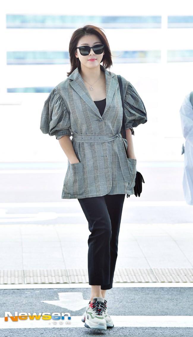 Ha Ji Won khoe street style cá tính cùng áo tay bồng cách điệu mix quần ống suông và giầy sneaker khỏe khoắn.