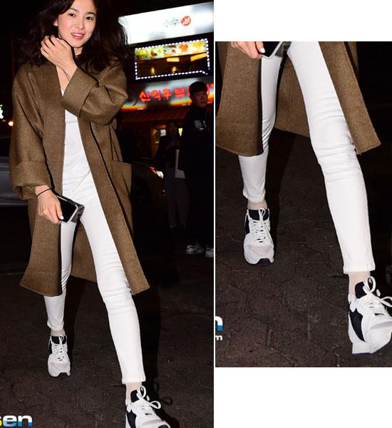 Gần đây, Song Hye Kyo đã có buổi tiệc ăn chia tay với đoàn làm phim "Hậu Duệ Mặt Trời" diễn ra tại một quán ăn ở quận Gangnam, Seoul. Ngay khi xuất hiện, cô đã thu hút sự chú ý mạnh mẽ của giới truyền thông lẫn người hâm mộ. Nữ diễn viên sinh năm 1981 diện quần skinny kết hợp áo phông trắng bên trong và áo choàng dáng rộng ngoài. Cô còn mix thêm đôi giày sneaker năng động.