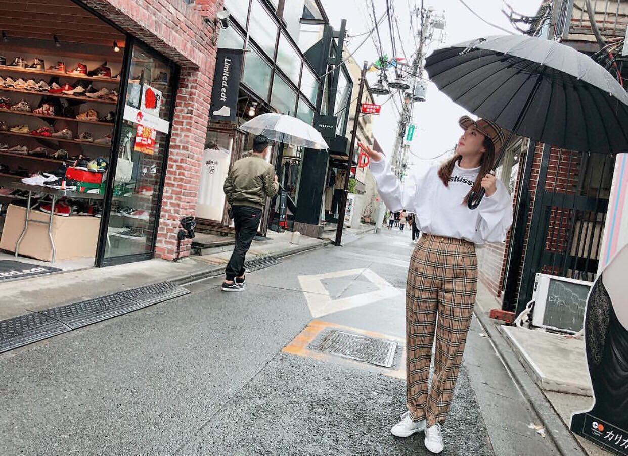Dara khoe street style nổi bật với áo thun với quần kẻ burberry kết hợp mũ lưỡi chai ton-sur-ton.
