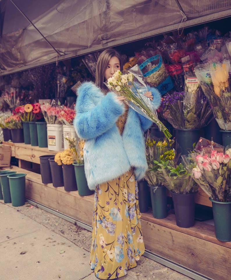 Khoe outfit nổi bật trên phố, Tiffany diện áo lông to sụ khoác ngoài váy maxi dài họa tiết hoa lá hẹ.