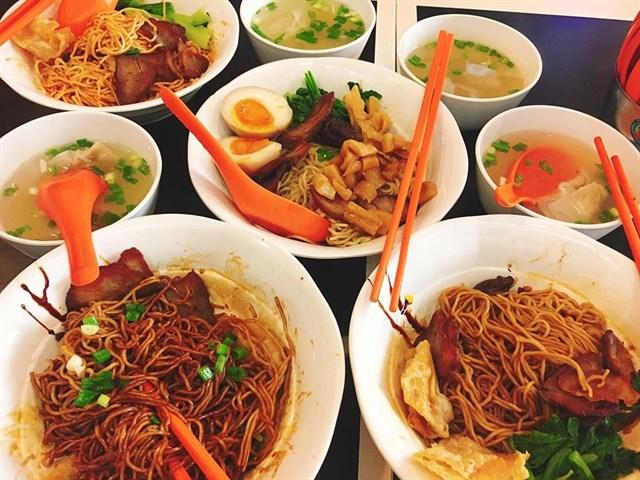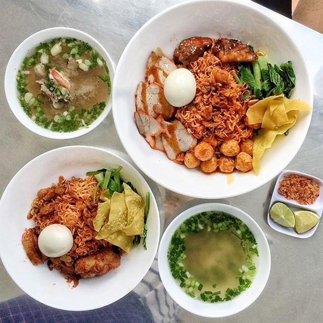 Món mì ở đây xứng đáng lọt top "đệ nhất mì trộn" với hương vị không thể lẫn vào đâu được. Mì trộn lòng đào vị chua chua, ngọt ngọt ăn kèm cùng thịt xá xíu, cá viên, nào sườn, hoành thánh chiên, trứng lòng đào, tôm, thịt bò... Mì gói trụng vừa tới nên không bị mềm yểu cọng mì dai giòn có tốp mỡ và hoành thánh lá chiên siêu giòn và thơm.