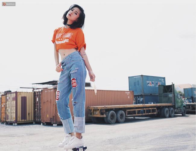 Chiếc áo phông bình thường đã được Hà Trần "chế" thành crop top và diện cùng
