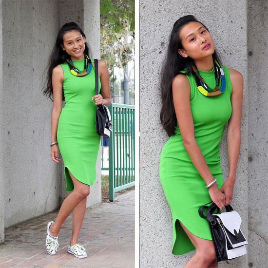 Váy liền thân ôm sát màu xanh, giàu thể thao tạo nên tổng thể mới