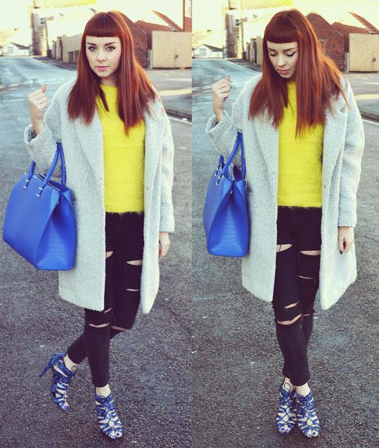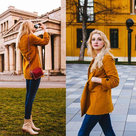 Cô nàng nước Anh - Eleonore Marie Stifter mặc áo dạ vàng, quần skinny xanh,