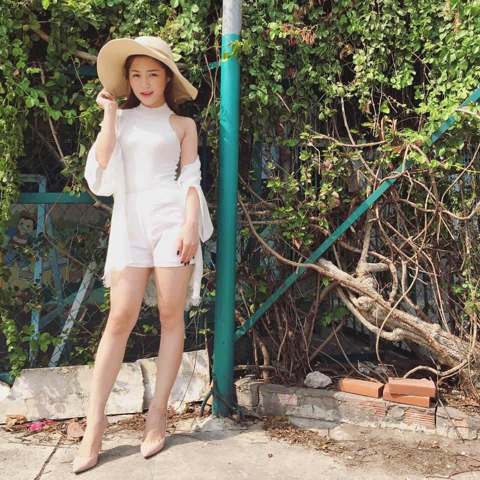 Ở một set đồ khác Hương Tràm lại khoe chân dài với quần short trắng. Giày cao gót