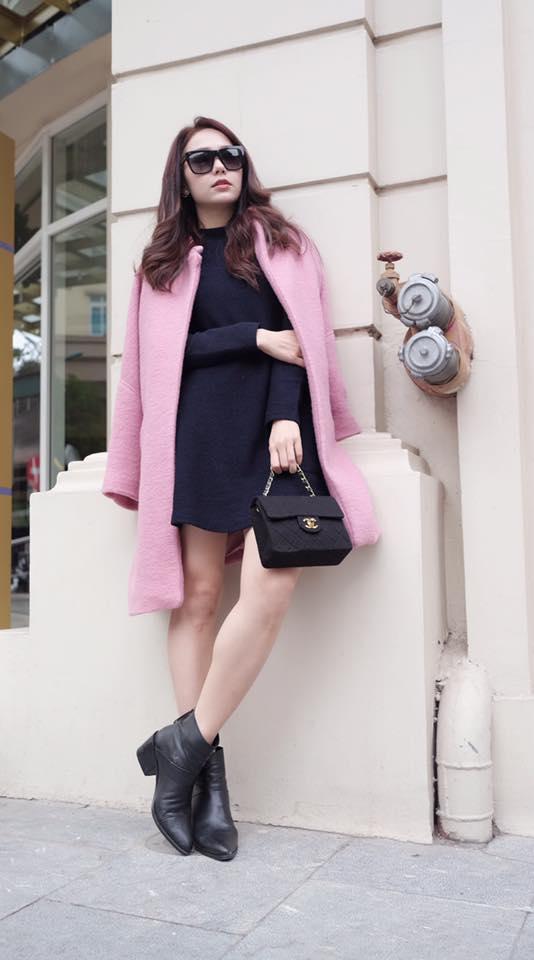 Áo khoác dạ màu hồng tím ngọt ngào được Minh Hằng kết hợp ngoài váy liền thân.