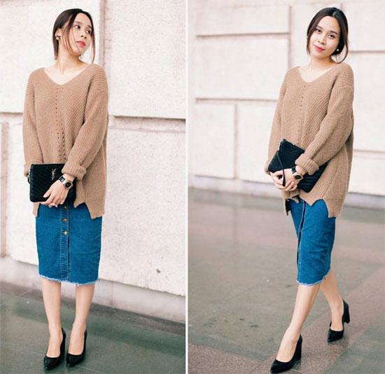 Lưu Hương Giang phong cách với áo len oversize kết hợp cùng chân váy denim