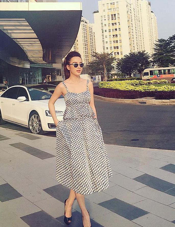 Angela Phương Trinh xuống phố với váy họa tiết kẻ đen, trắng. Để tôn dáng hơn
