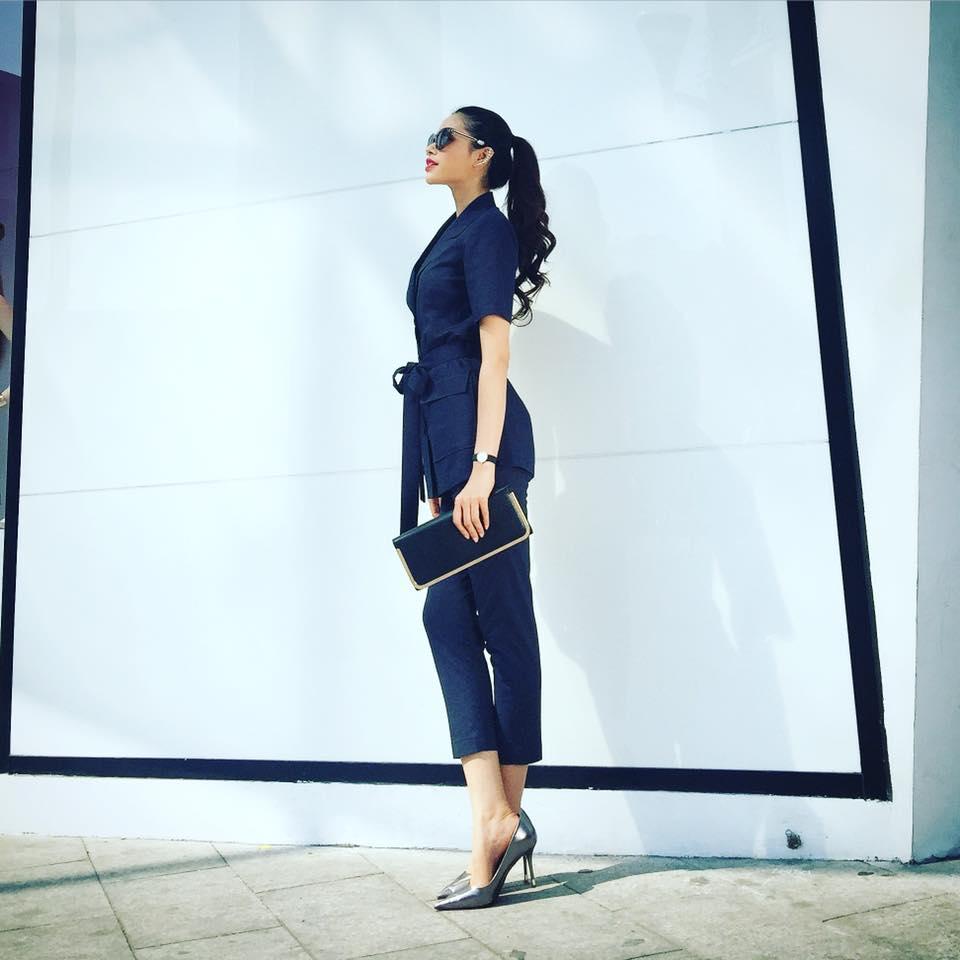 Phạm Hương sang chảnh với bộ vest cách điệu tông màu trầm. Cô cũng không