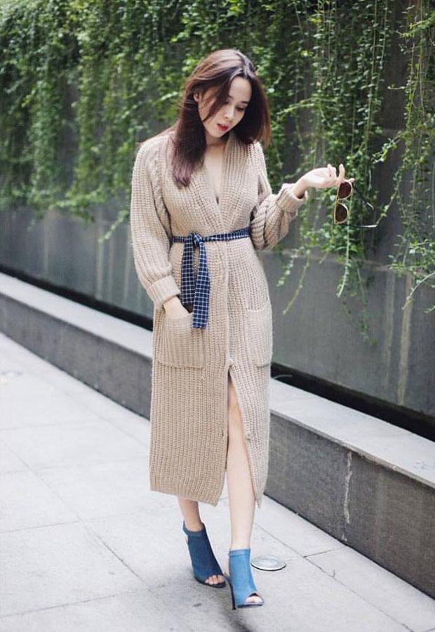 Lưu Hương Giang cực phong cách khi tạo điểm nhấn cho chiếc áo cardigan dáng váy ngắn khi cô ra Hà Nội.