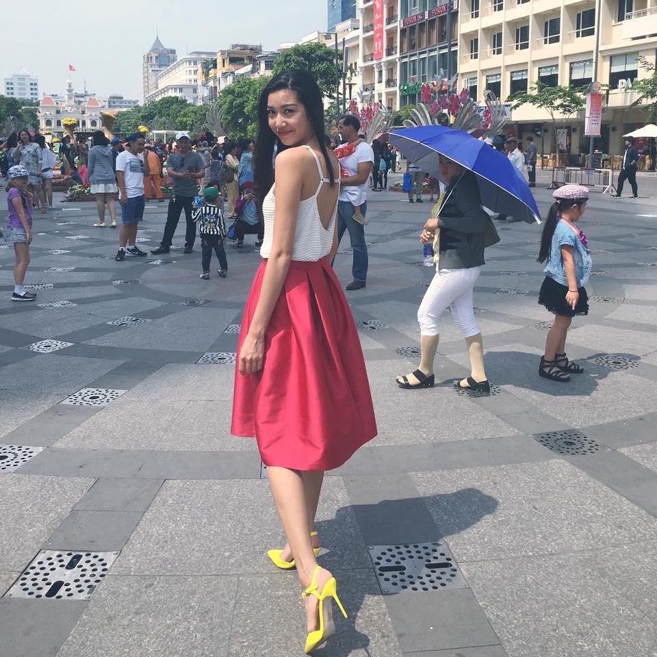 Váy suông dáng ngắn cũng là item giúp Huyền My thoải mái khi đi lại.