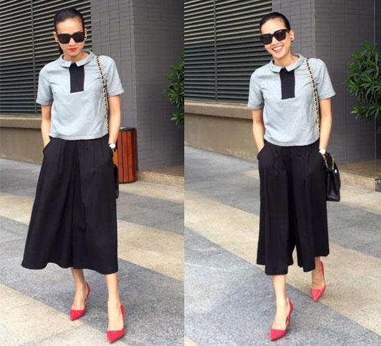 quần này cô chọn áo dáng ngắn và giày cao gót đi cùng.