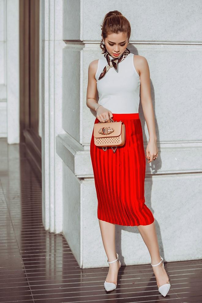 Khi chọn trang phục đi cùng chân váy đỏ nổi bật bạn có thể chọn áo, giày tông