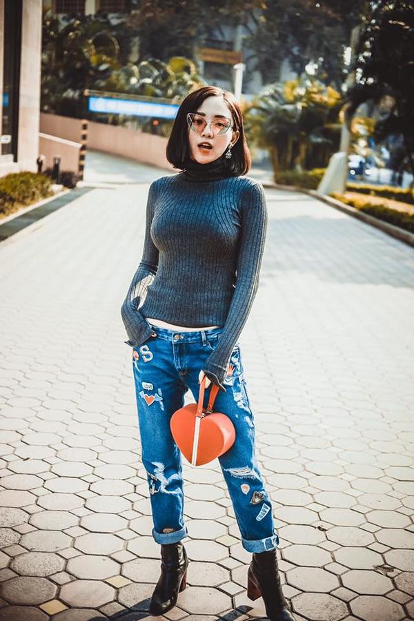 Tóc Tiên cá tính với áo len cổ lọ ôm sát mix cùng jeans rách in họa tiết. Đôi boots
