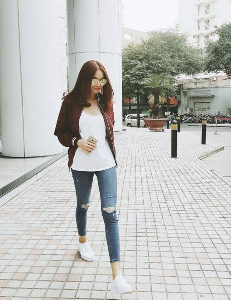 xuống phố là áo phông, quần jeans rách và giày thể thao.
