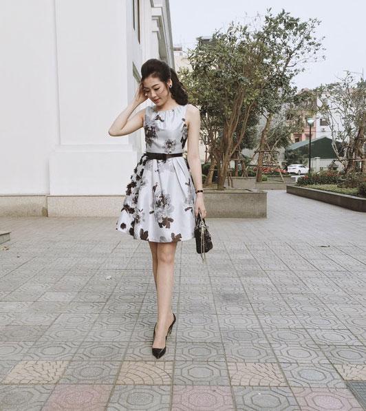 Tú Anh khơi vẻ đẹp nữ tính với váy liền thân họa tiết dáng xòe nhẹ nhàng.